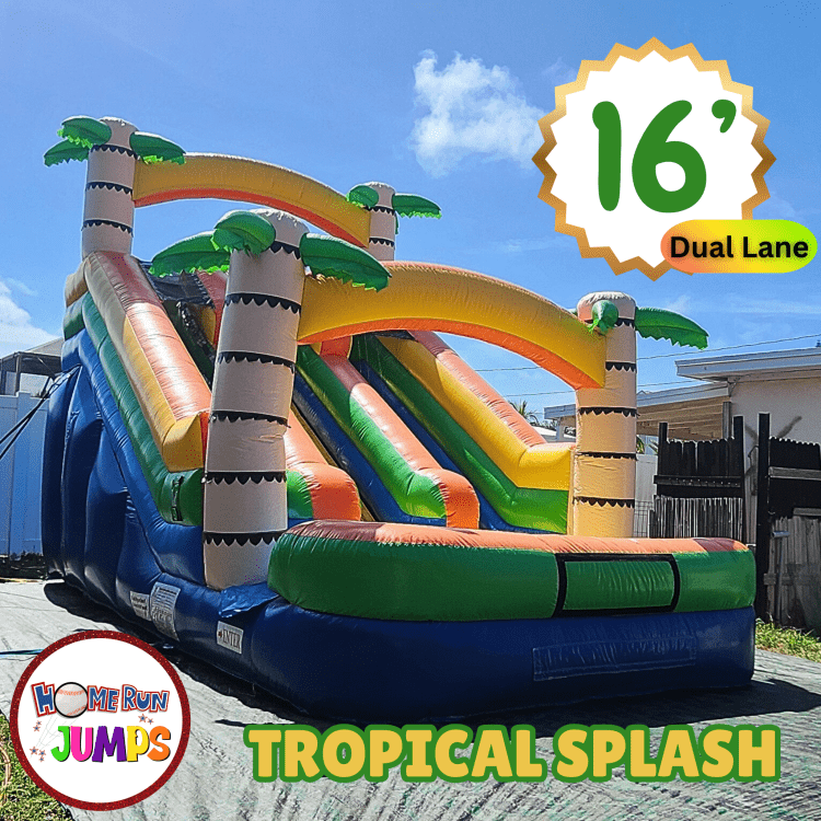 16' Tropical SplashBounce & Slide Package:16' Tropical Splash102577521_2598651_22814811100 This tropical themed, dual lane waterslide with splash pad is guaranteed to bring joy to everyone even on the hottest Florida day! The vibrant yellow, orange, green, and blue palate makes this slide an excellent choice that compliments any theme.